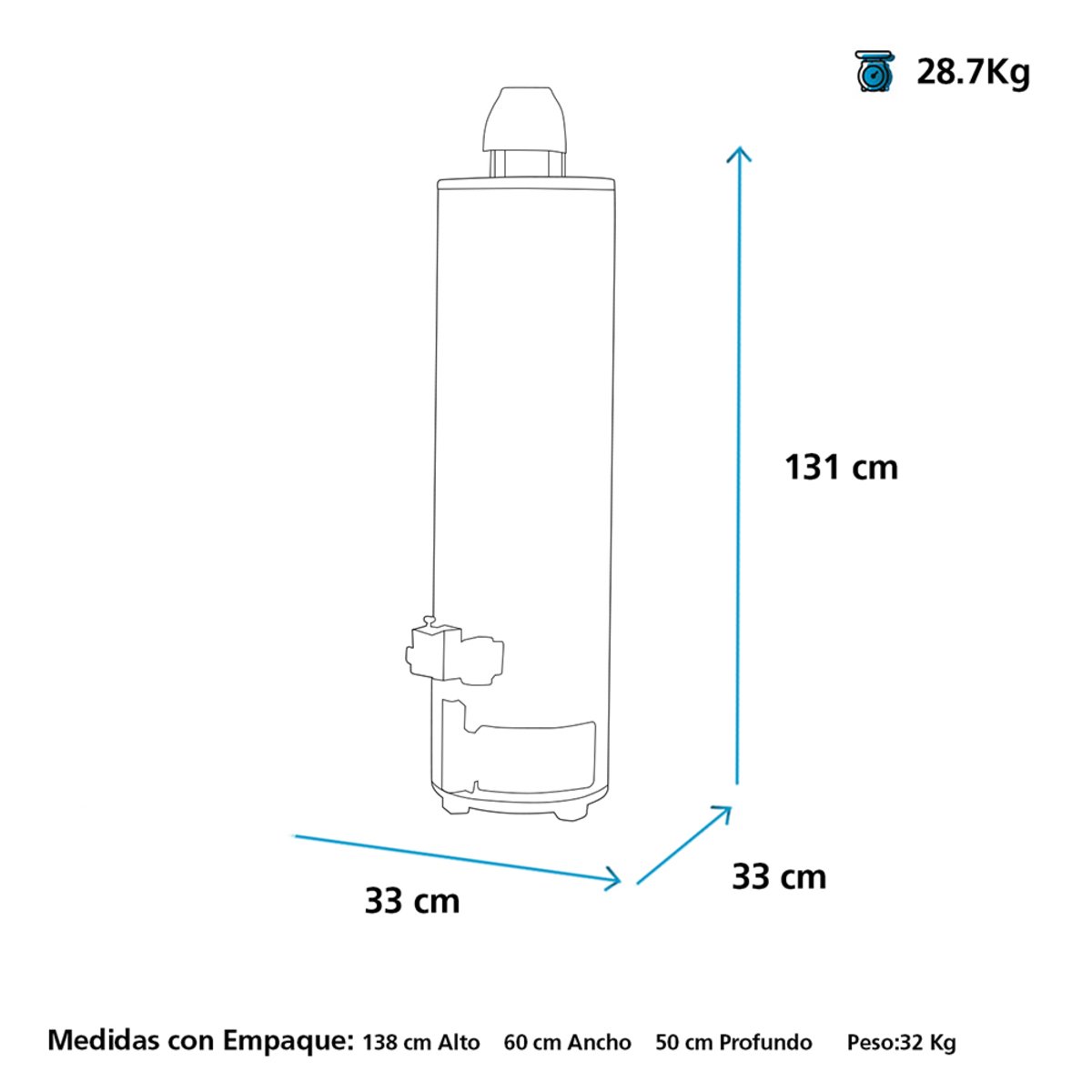Atributos del producto: Alto 103.1 x Ancho 44 x Profundo 44 cm. Peso acumulador lleno: 124 kg. Magnitud potencia: 2000 W.