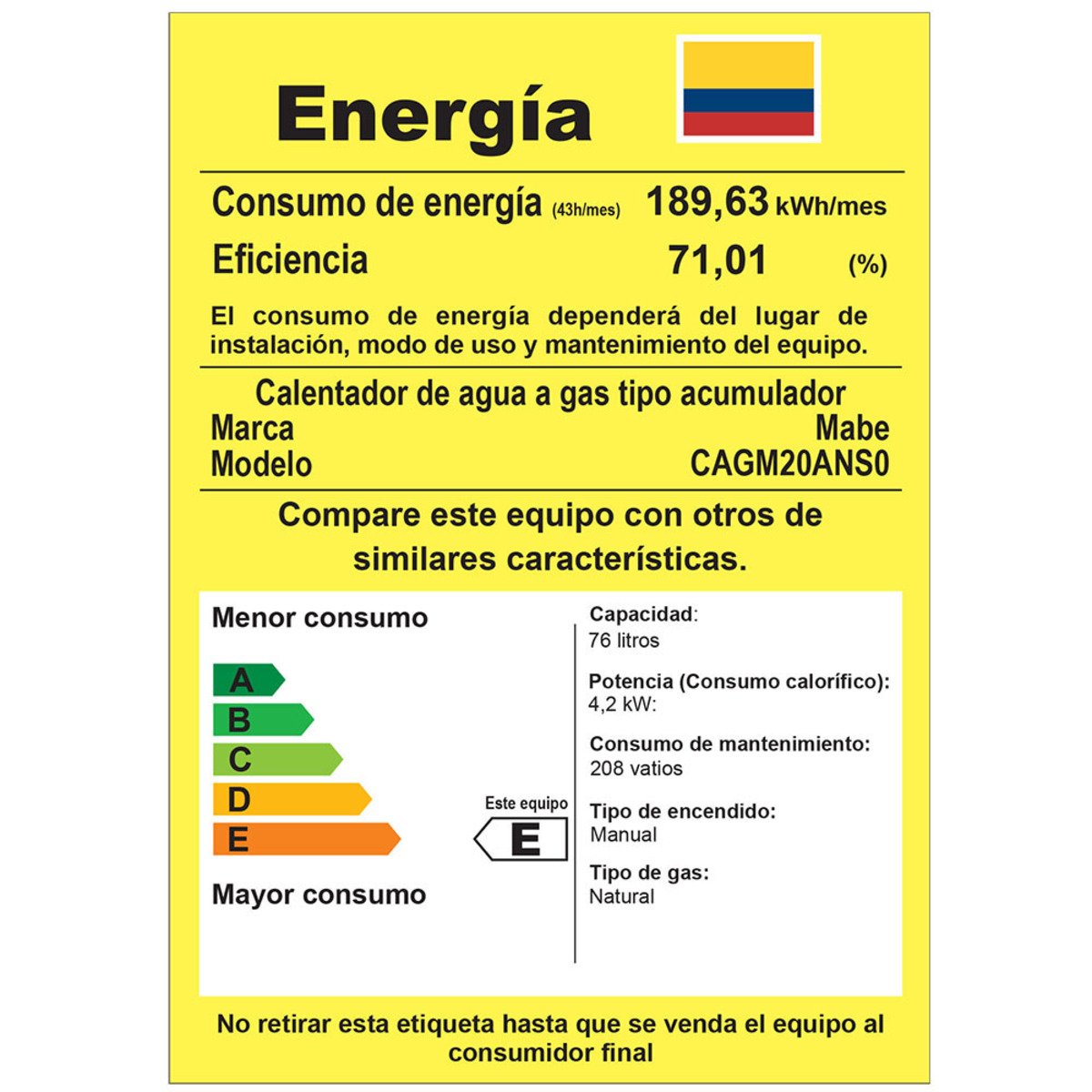 Calentador de agua, acumulación a gas natural, capacidad de 20 gal, no requiere ducto de evacuación y cuenta con botón de luz indicador de termostato. Es de fácil manejo, practico y posee control eléctrico, apaga y anula el paso de gas de ser necesario. Cuenta con tanque porcelanizado, llave de desagüé y fuentes de calor que brindan mayor comodidad.