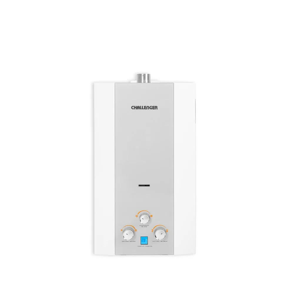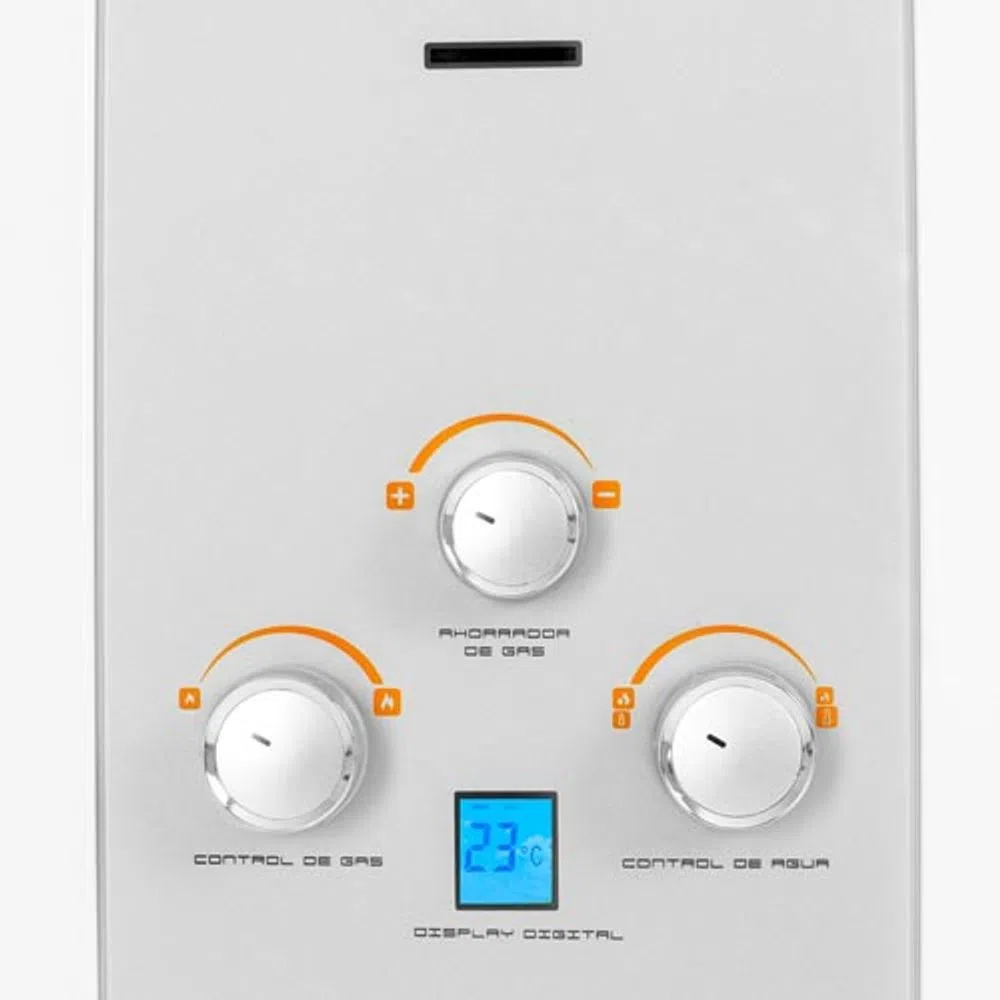 Calentador de paso a gas 6 litros, Tiro Forzado. Incluye ducto de evacuación, se enciende de manera automática con solo abrir la llave. Se apaga después de 40 minutos de uso continuo; controlando el tiempo de tus baños. Su temperatura es regulable y cuenta con múltiples sistemas de seguridad.